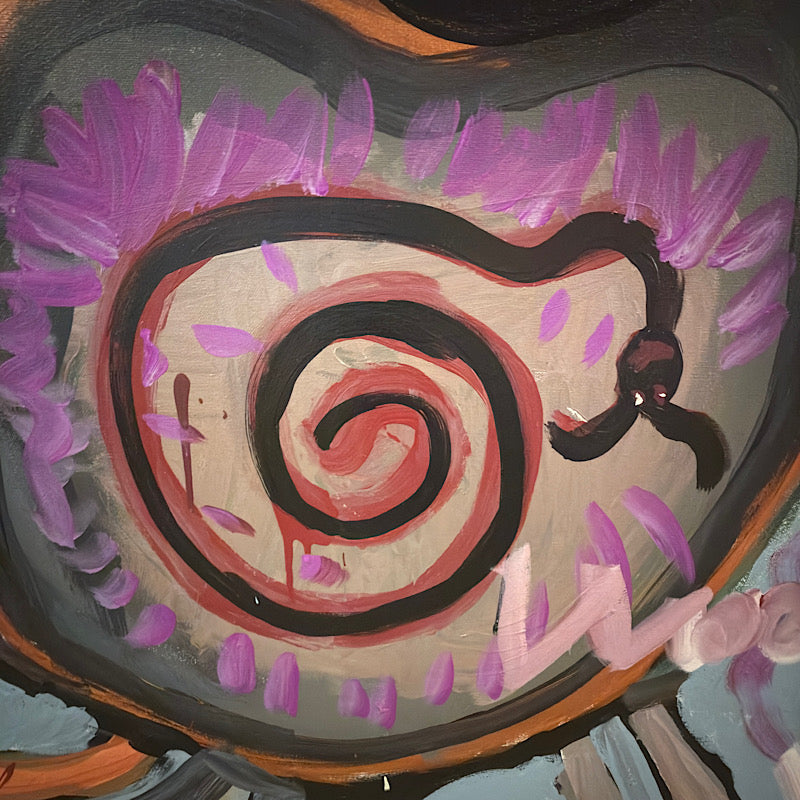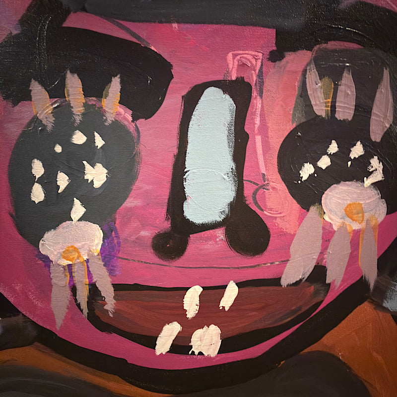 Unmuted is full of surprises. You'll see tiny, careful drawings where Clara used hundreds of little shapes to build something bigger—like a giraffe with a rainbow tale she saw at the zoo, or Chocolate, her guinea pig who she loved so much, or a friend's dog. You'll find these mix, big paintings, small artworks, some bright colors and glitter cnstrating with  pieces are soft and gentle with pastels.