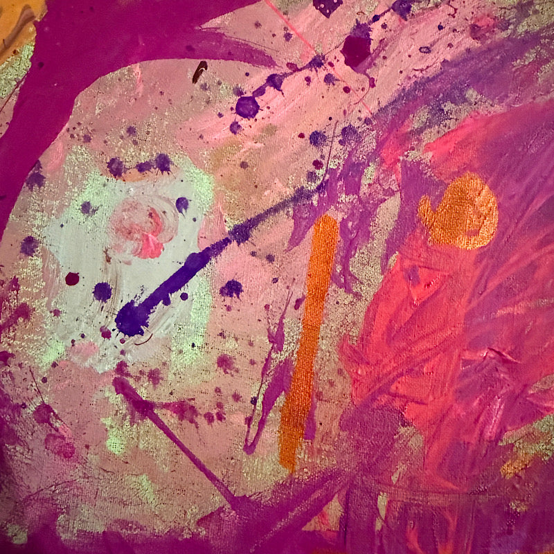 The more I look at this piece, the more I see a warrior rising: like a phoenix coming up from the ashes. That purple form in the center with the orange wings, those sweeping movements of color, the way everything seems to be lifting up and transforming. Maybe you'll see it too, or maybe you'll see something completely different. That's the beauty of abstract art. It shows you what you need to see.