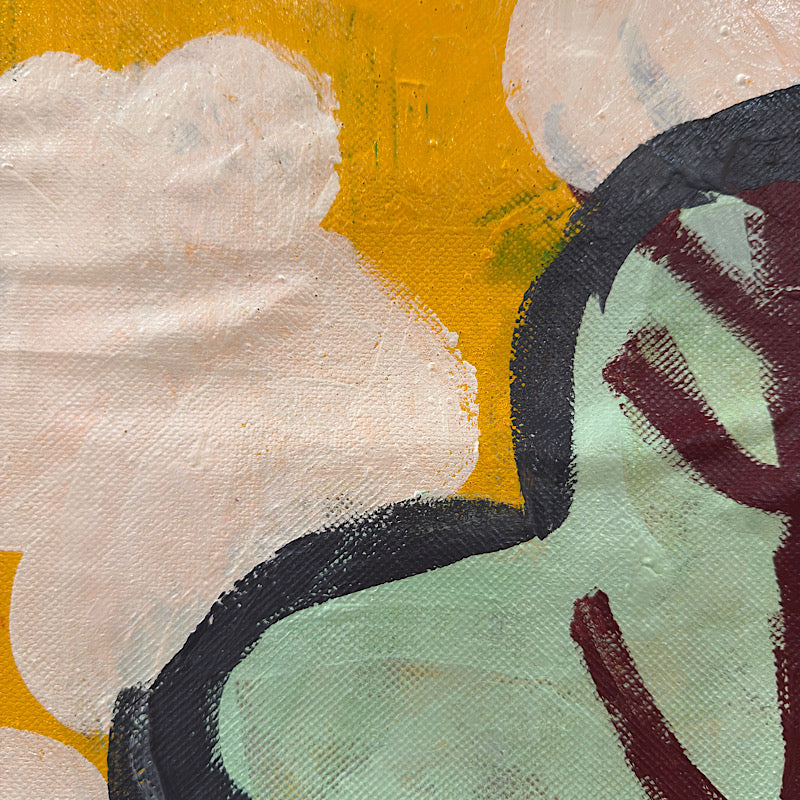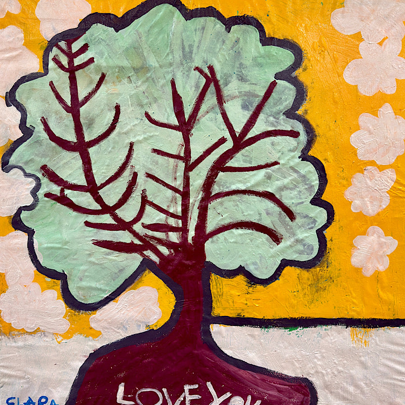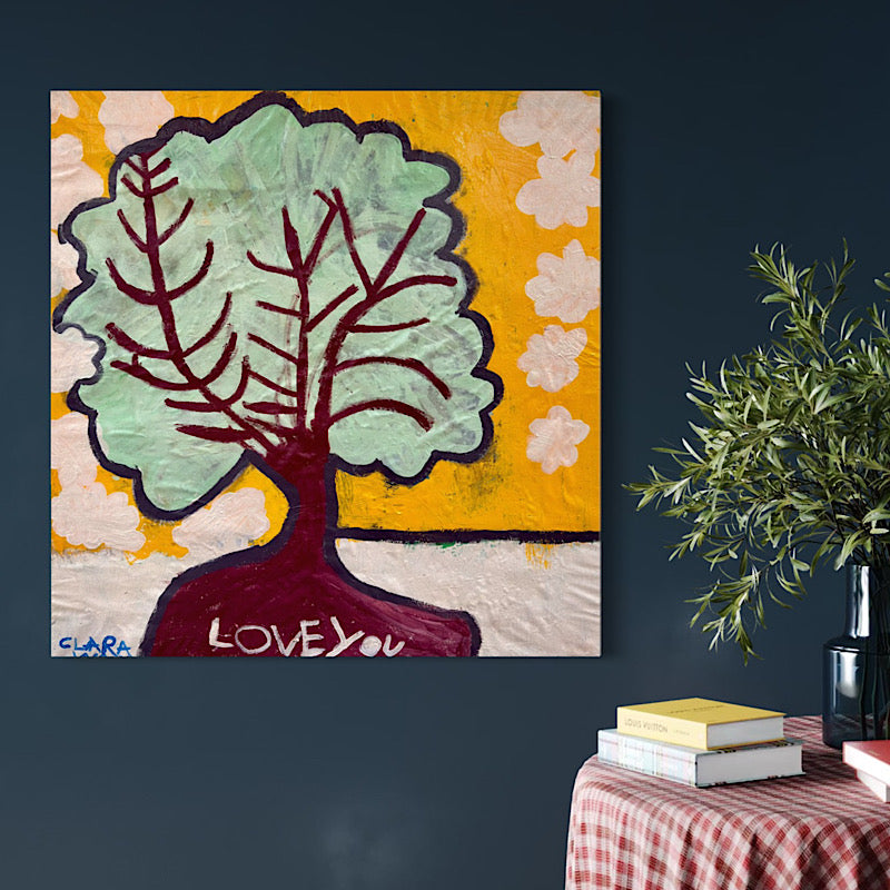 This artwork is a bloom of strength, love, and growth. A big, bold tree shouting LOVE YOU from its roots. The yellow sky sings joy. The clouds dance. And the recycled canvas, stretched by Clara and Carlo, moves slightly with the light—like life breathing in and out.