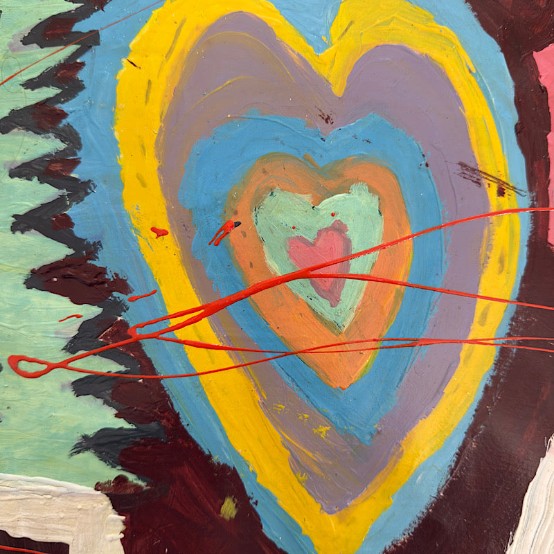 Big smile. Big legs (she painted it after her second surgery—so you’ll see that detail). Happy clouds. Her iconic happy sun. A rainbow heart. And… a little happy friend by her side that makes me smile every time I look at it.