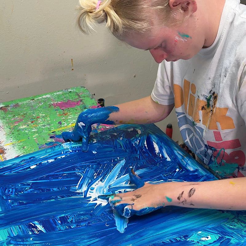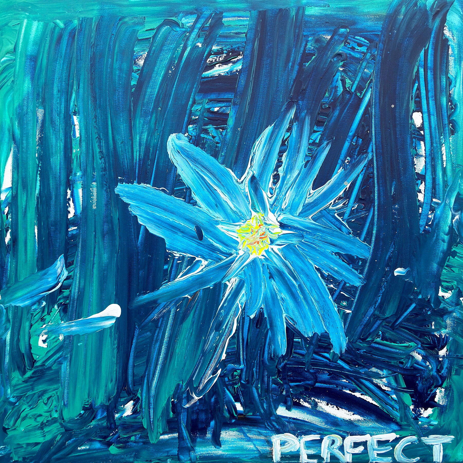 Clara painted this artwork mostly using her right hand — the hand that’s weaker and doesn’t always work the way she wants it to. She experimented with movements and textures, using both hands to bring Perfect to life.
