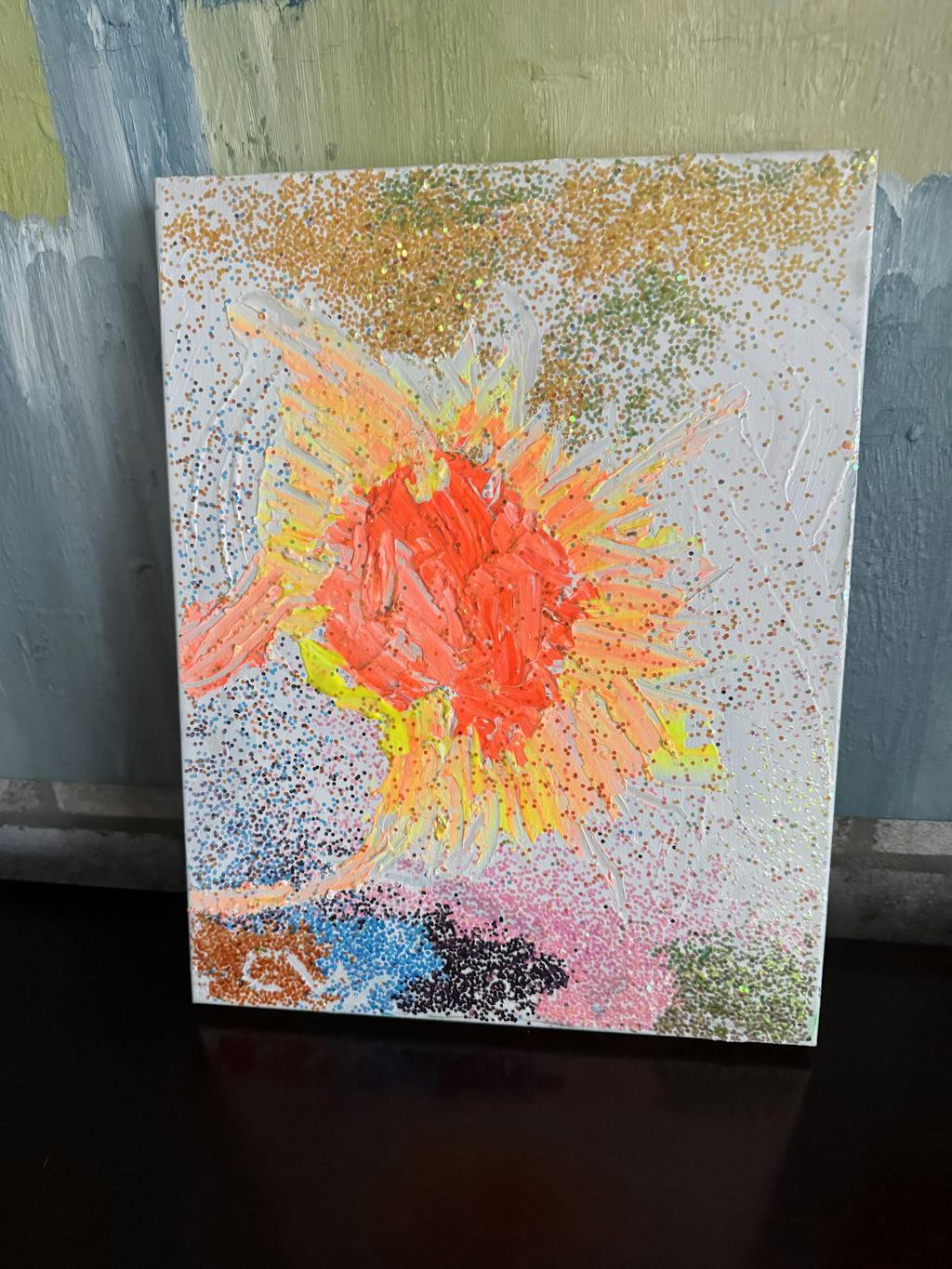 It is a painting of spring sun rise. I think it will be hung in North Carolina house. Looking out at the mountains and flowers.