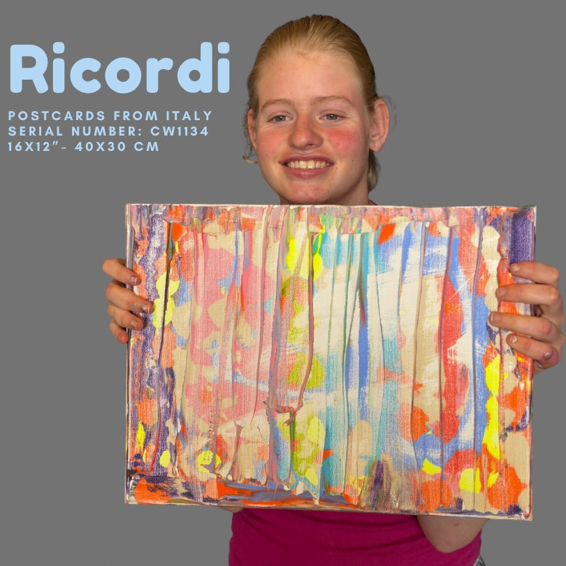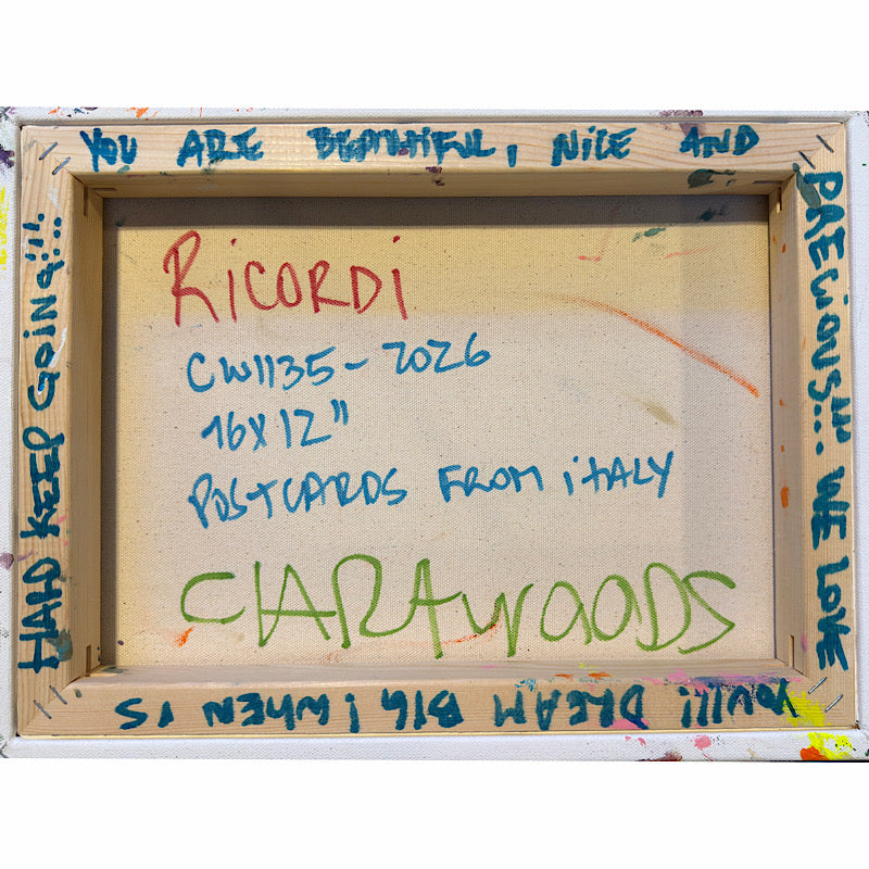 16x12" (40x30cm) - Ricordi means memories in Italian. Memories are what shape us. The colors we carry with us, the feelings that show up when we least expect them, the moments that made us who we are. Clara lives in her ricordi all the time. They fill her paintings, her excitement, the way she connects everything to a feeling or a taste or a person she loves. Memories aren't just the past; they're alive in us. How we keep shaping our lives with love, finding beauty in ordinary things, adding new colors as we go. Your ricordi are yours, but the way they live inside you and make you see beauty everywhere? That's something we all share. Hang this somewhere you'll see it and let it remind you that your memories matter. Keep collecting those moments. Keep finding the beauty. It all becomes part of you.