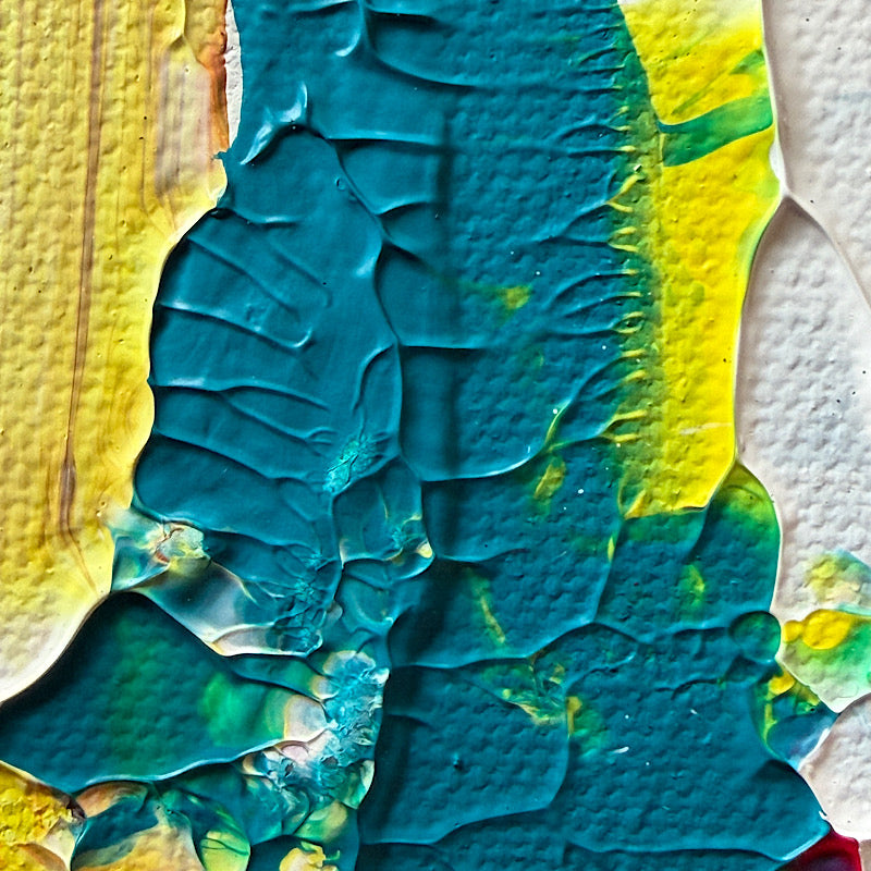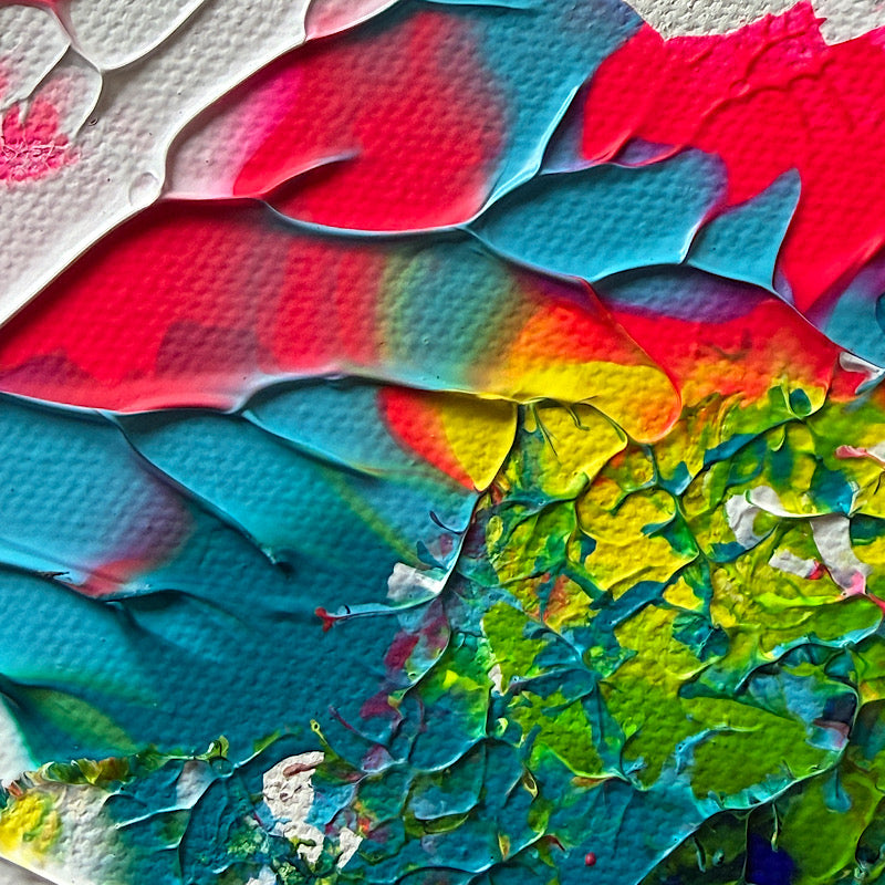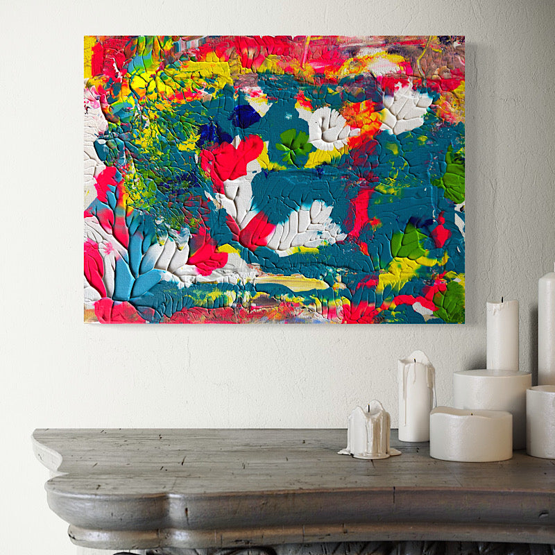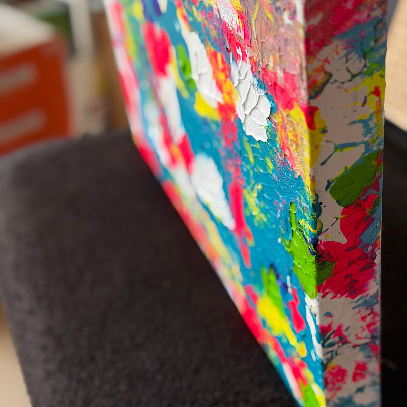 18 x 14" (45.7 x 35.6 cm): Many times in Clara’s life, people looked at her and thought about the things she could not do. That happens a lot. People see the limits first. But Clara has always had a different answer for that. Instead of explaining, she just keeps going. Watch me. That is the feeling of this painting. Watch me paint. Watch me try. Watch me find my way. Step by step, Clara keeps showing that life can be bigger than what others expect. The colors in this painting move everywhere. It is energy! It is someone saying without words, just look. Watch me.