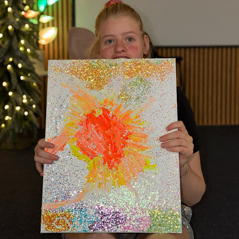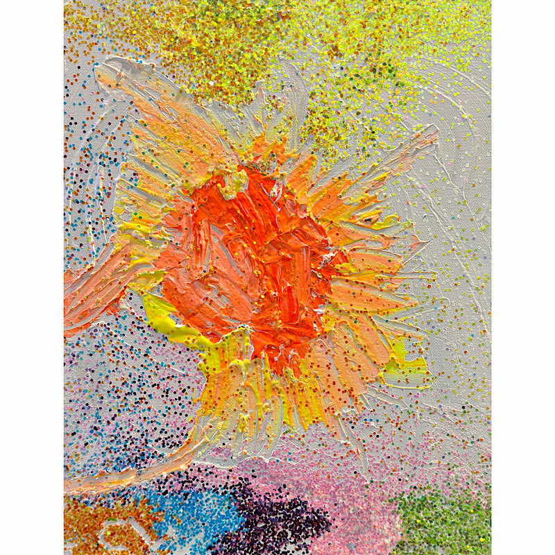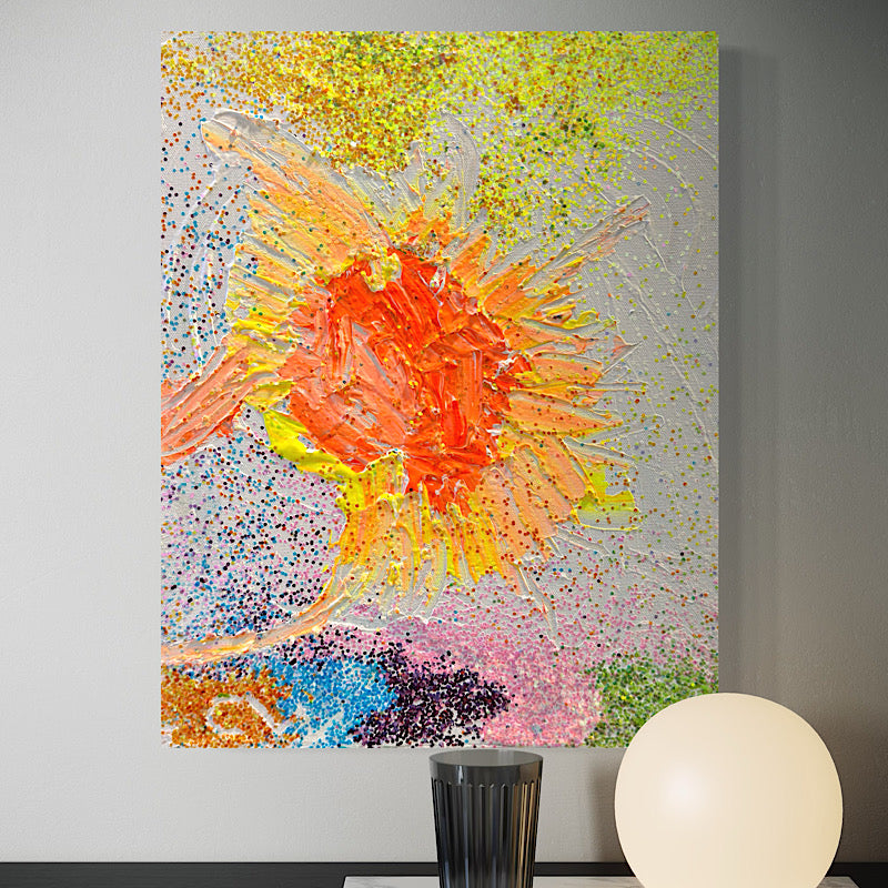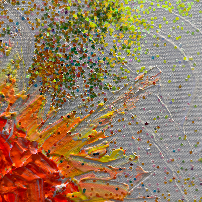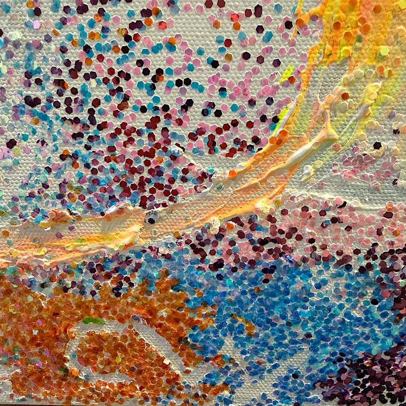 Another abstract session in Clara's studio, and this time she made magic with glitter—so much glitter that this painting changes color depending on the light. It's like watching a rainbow move across your wall.