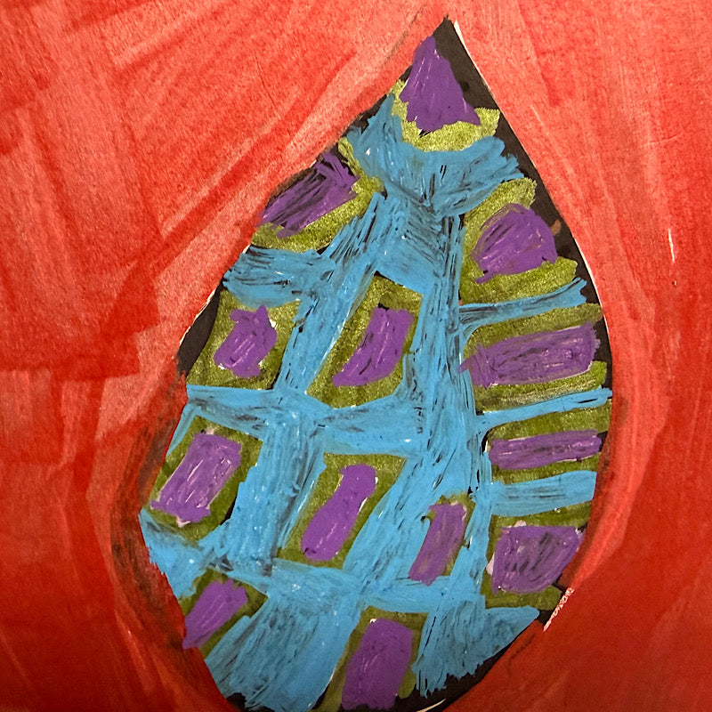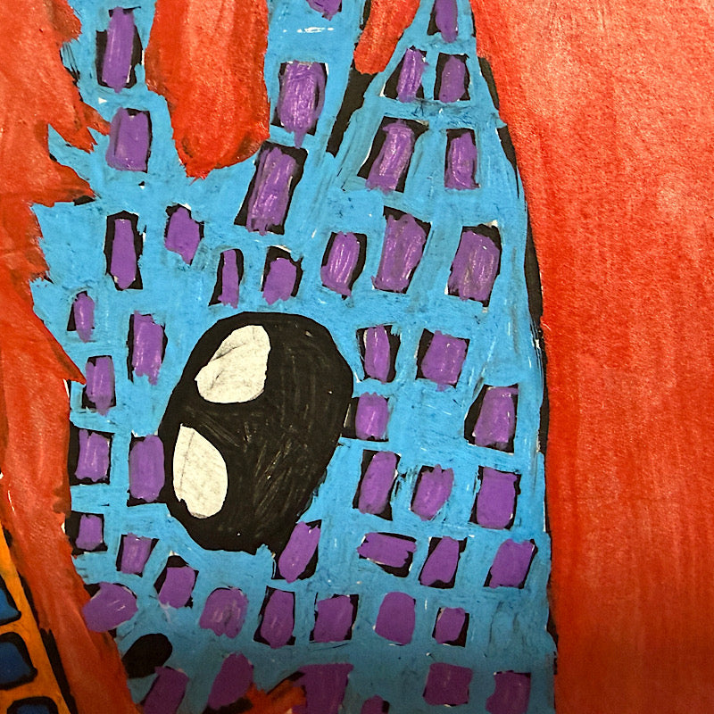 Look at how different they are. David in orange and blue squares, bold and warm. Blu in purple and blue, cooler tones, that incredible leaf-shaped head reaching up (I love it).