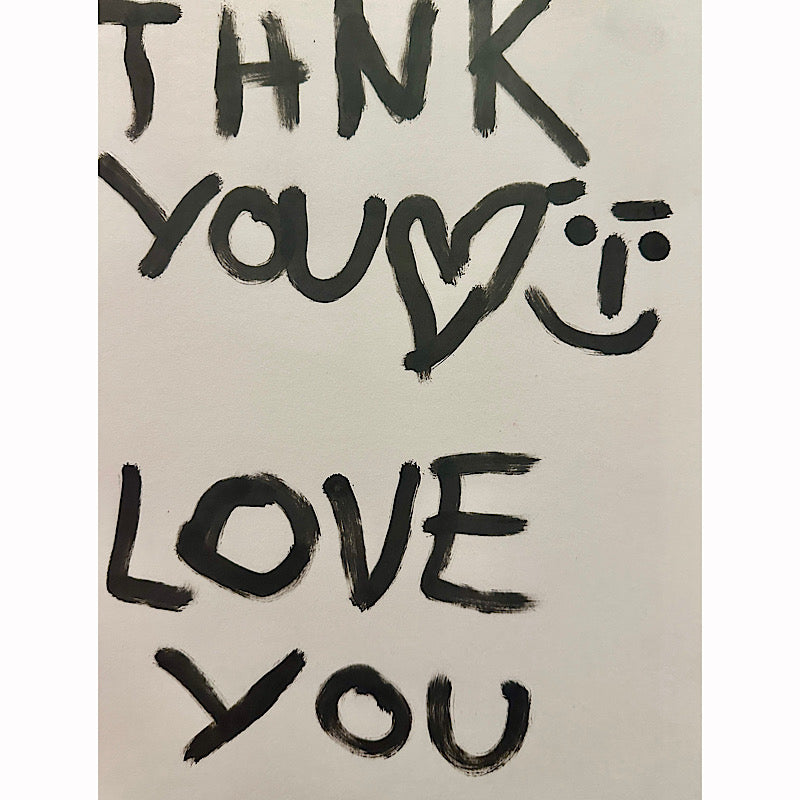 This iconic drawing by Clara is all about saying thank you and love you—but with a twist! Clara can’t write, but she copied these words in her own way, and guess what? It’s missing an H. And that’s what makes it so special!