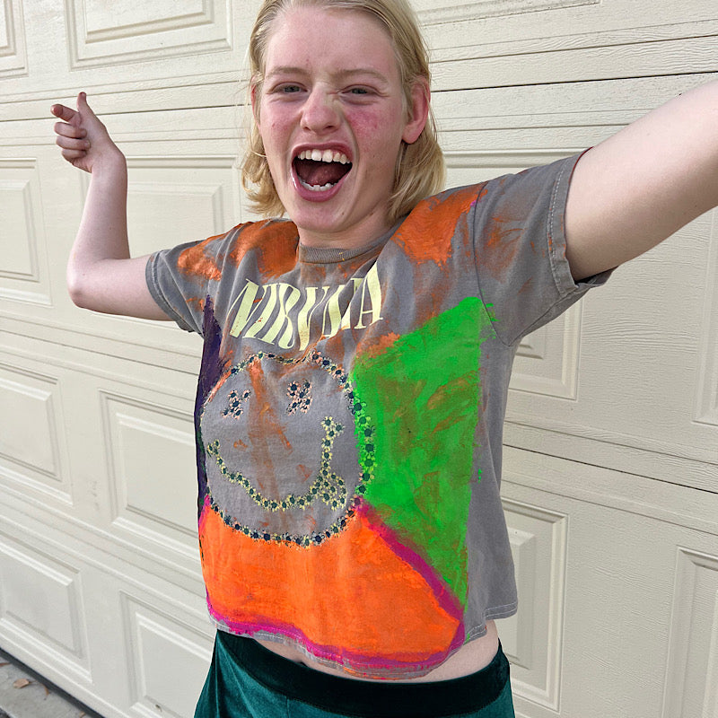 Each piece of clothing in this collection is unique. Think of them as Clara's painting buddies - they've been with her through thick and thin while she created her beautiful artworks. It's like they've been on an adventure, getting splashed with paint and becoming artworks themselves!
